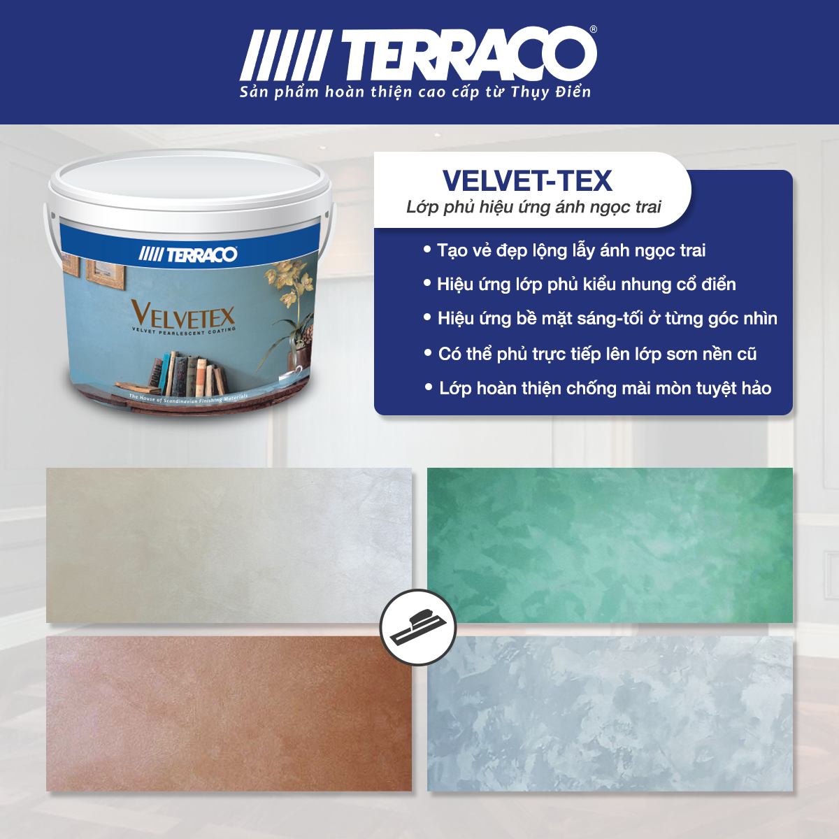 Là giải pháp trang trí nội thất chuẩn Châu Âu - lựa chọn hàng đầu cho những gia chủ yêu thích sự tối giản, cổ điển nhưng cũng không kém phần sang trọng và thời thượng. Đúng như tên gọi, VELVET-TEX tạo hiệu ứng bề mặt hoàn thiện như một lớp nhung cổ mang đến cảm giác ấm cúng cho ngôi nhà với sắc thái sáng-tối và hiệu ứng lập thể sinh động.