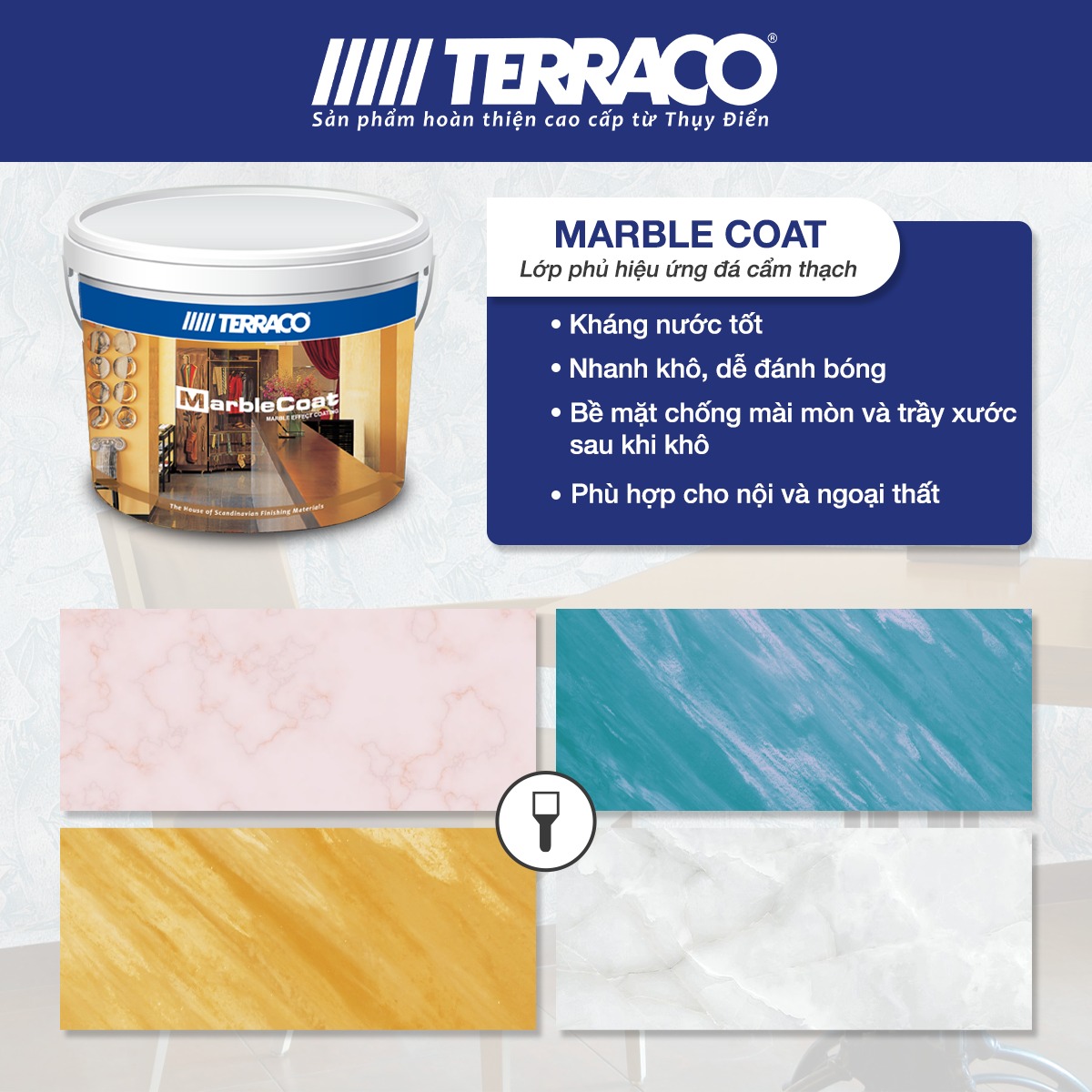 Là sản phẩm đặc biệt vì khả năng tạo ra hiệu ứng đá cẩm thạch, mang lại hiệu quả trang trí cho không gian nội thất cũng như ngoại thất một cách độc đáo và thu hút ánh nhìn. MARBLE COAT cho ra bề mặt hoàn thiện đầy ấn tượng với sự kết hợp của hỗn hợp đa sắc màu và cách thức thi công khác nhau, thích hợp cho khu vực phòng tắm, sảnh khách sạn, nhà hàng, và phòng triễn lãm, v.v.