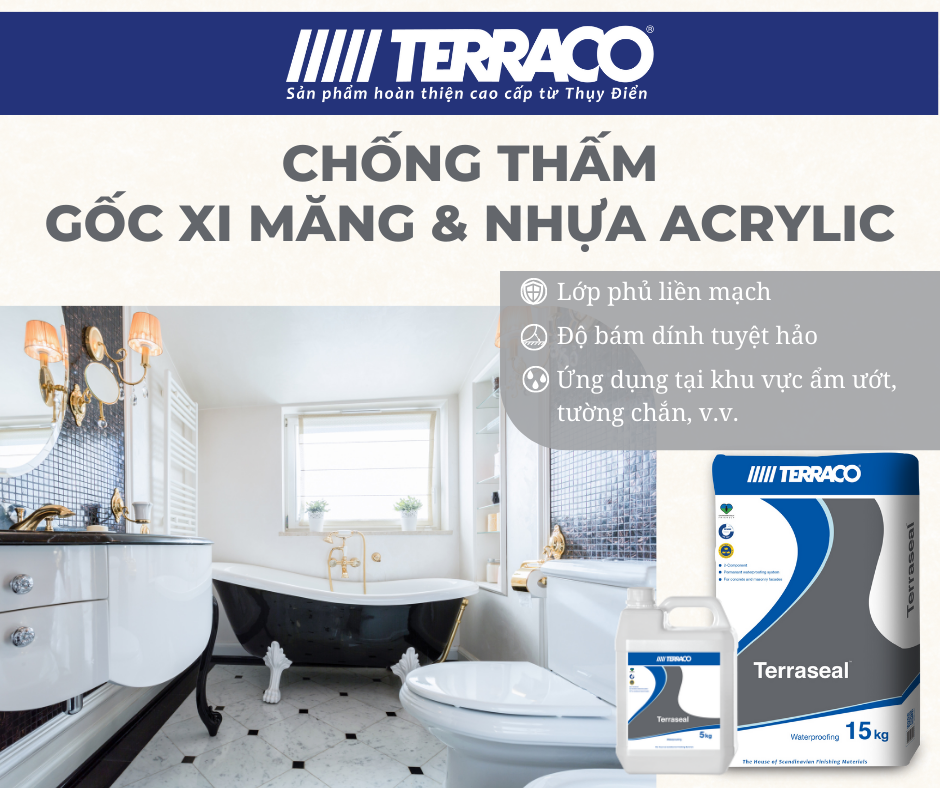 𝐓𝐞𝐫𝐫𝐚𝐬𝐞𝐚𝐥 là sản phẩm chống thấm thông dụng có tính đàn hồi ổn định và độ bám dính tốt, thích hợp để sử dụng cho các khu vực có kích thước ổn định như nền móng, khu vực ẩm ướt, tường chắn, v.v.