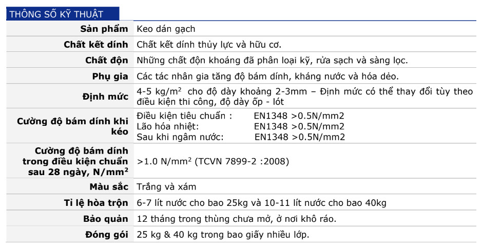 Terrafix là vữa dán gạch đa năng, dễ sử dụng, dùng để ốp – lót các loại gạch Ceramic, đá cẩm thạch và gạch miếng (mosaic). Rất tiện dụng để lát tường, sàn, cả nội thất lẫn ngoại thất cho các công trình xây dựng.
